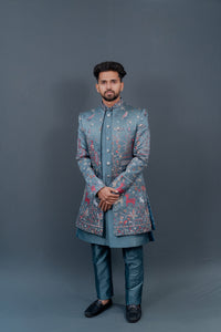 Matching Trousers: Accompanied by well-fitted silk pants in a matching teal tone, this sherwani delivers a cohesive and polished appearance.