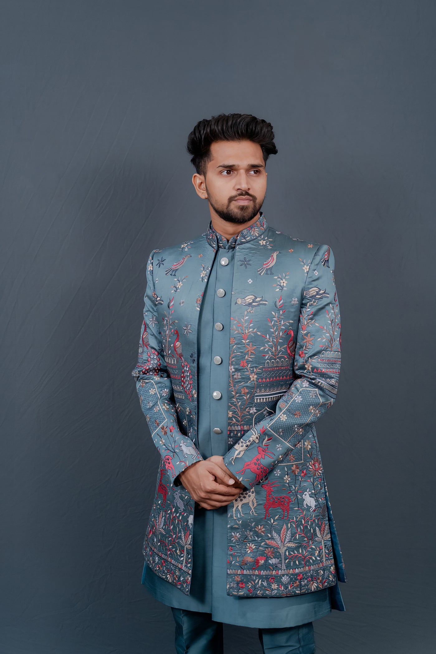Intricate Embroidery: The sherwani features an exquisite hand-embroidered design inspired by traditional Indian motifs. The vibrant threadwork includes detailed floral patterns, wildlife elements, and intricate foliage, adding depth and elegance.