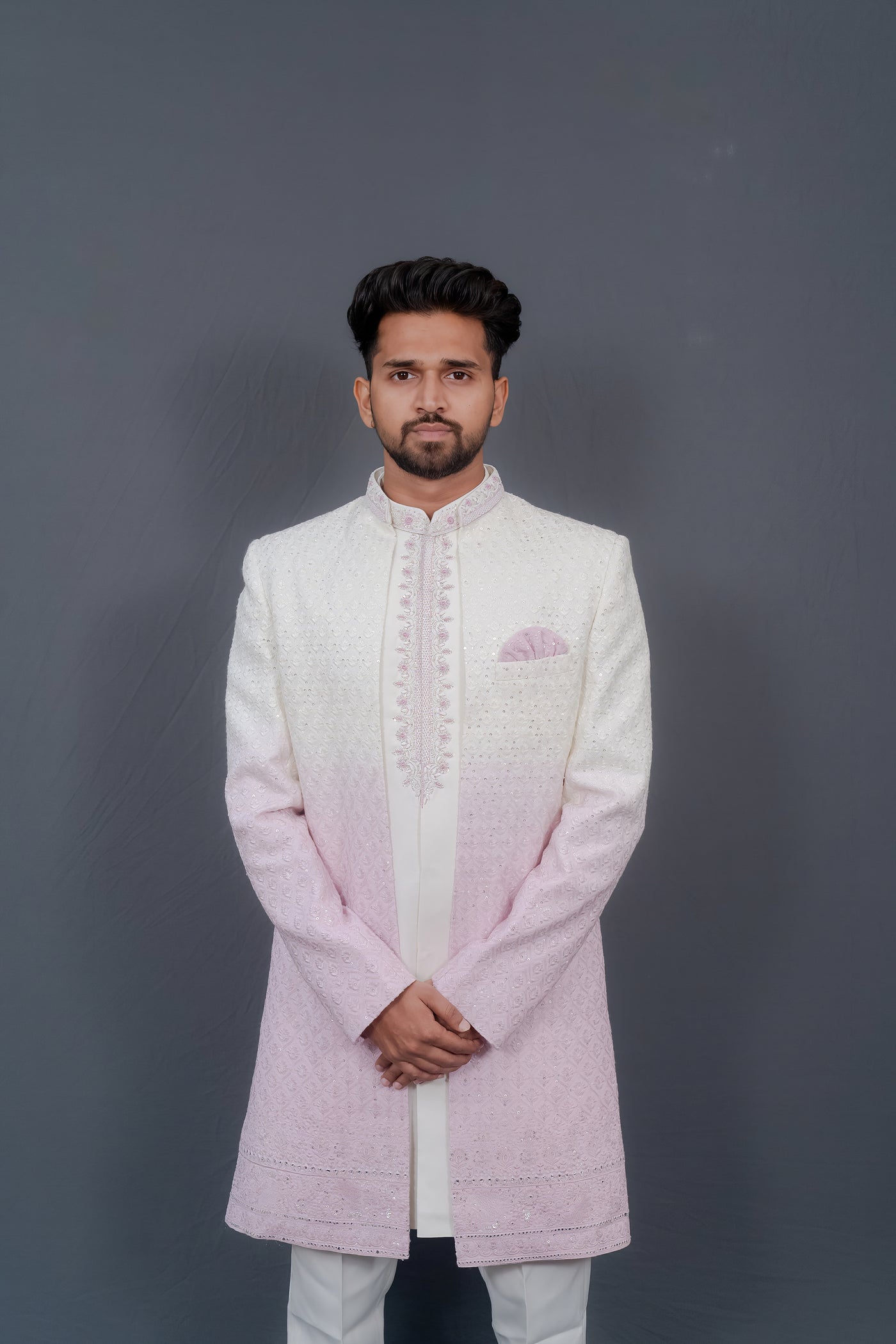 Unveil timeless elegance with this Ivory and Pink Gradient Embroidered Sherwani, a perfect embodiment of grace and refinement for special occasions. This exquisitely designed sherwani blends classic tradition with a modern color gradient, making it an excellent choice for weddings, engagements, and festive events.