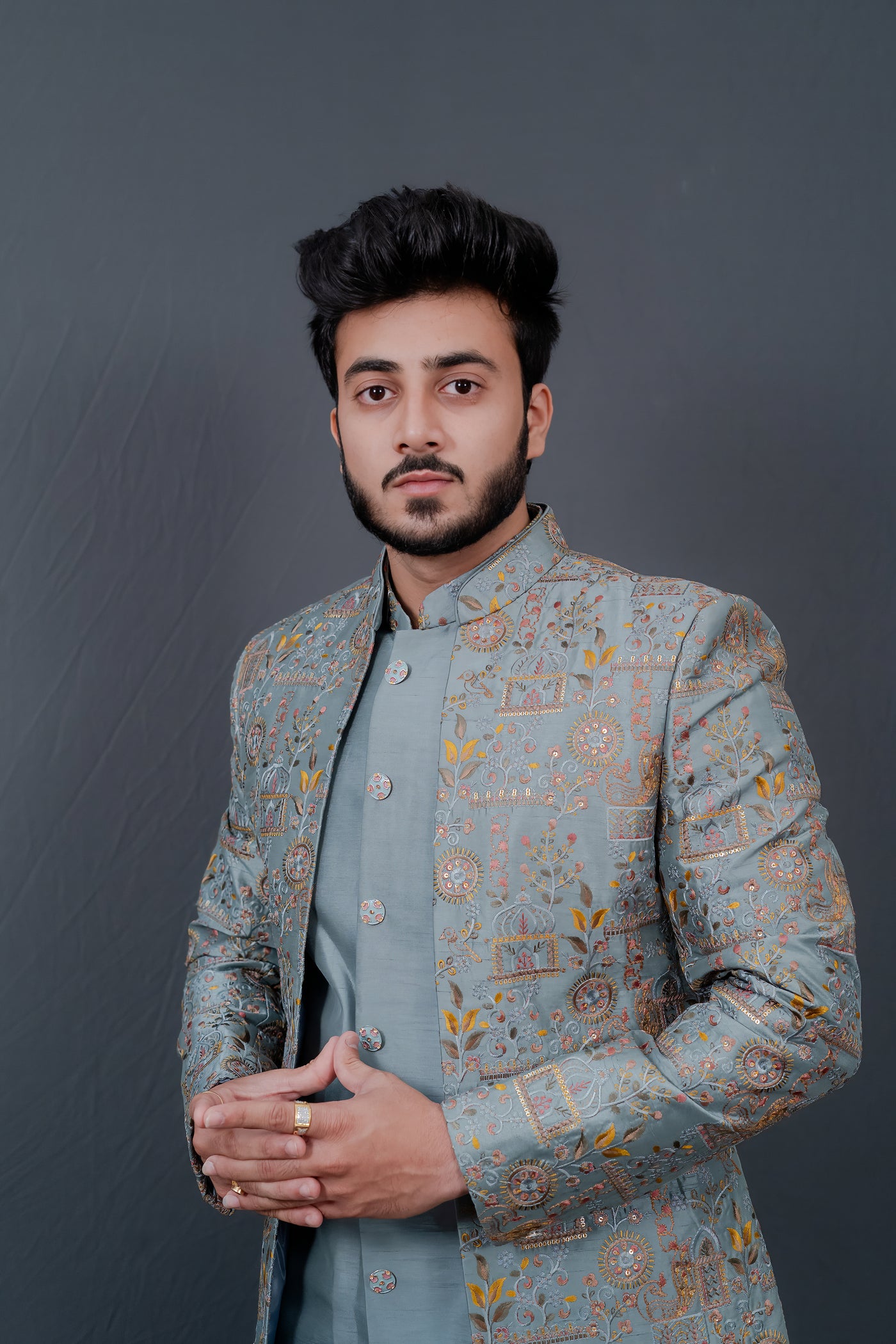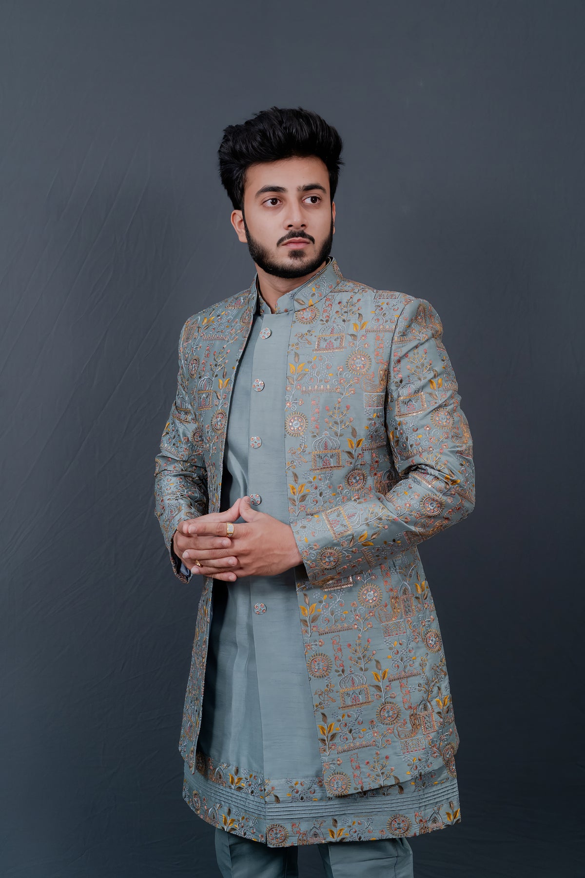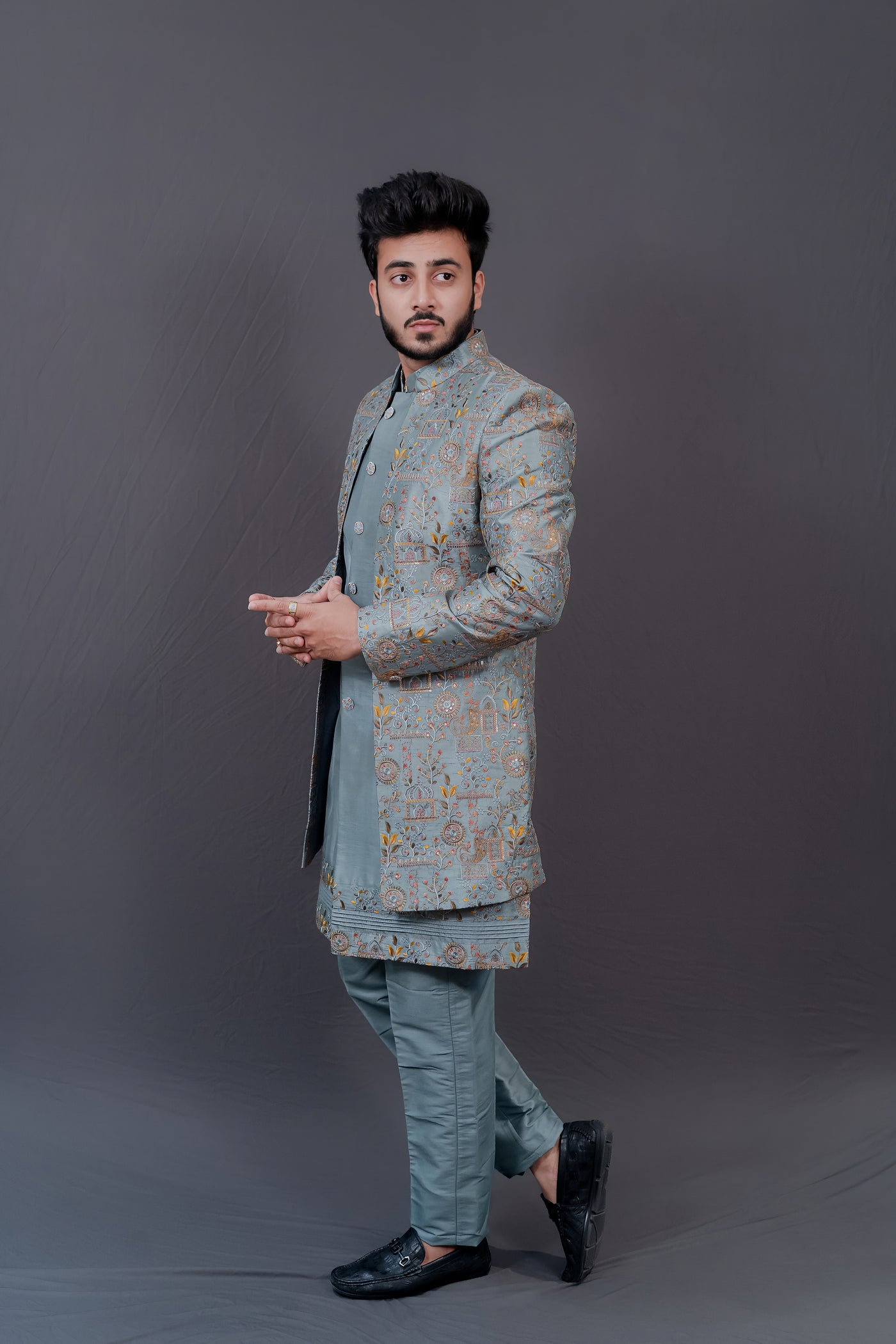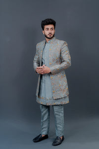 Elevate your style and make a statement with this exquisite Firozi Men's Indowestern Jacket Set Ensemble.