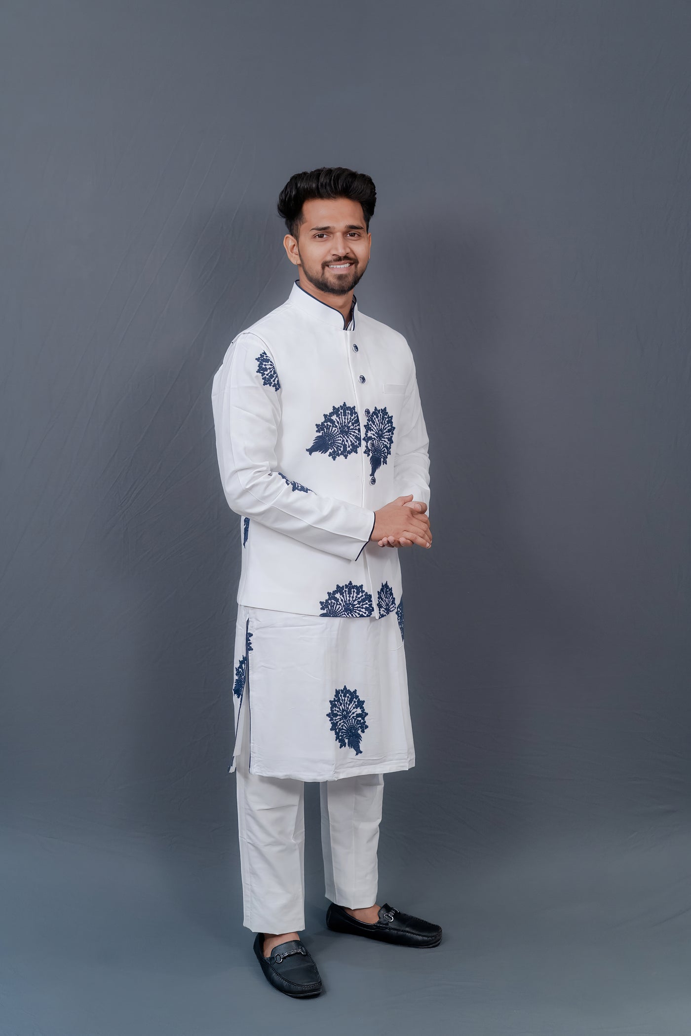 Men's White Kurta Set with Embroidered Jacket and Navy Blue Leaf Detailing