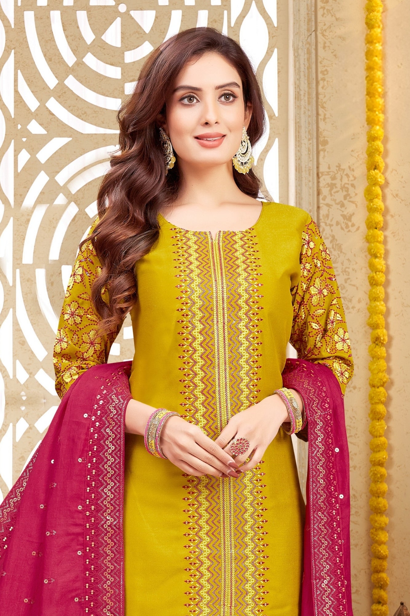 Step into the spotlight with this radiant yellow straight-cut pant dress, exquisitely paired with a contrasting magenta dupatta. Designed with detailed embroidery and luxurious fabrics, this ensemble is perfect for festive celebrations, weddings, and cultural events.
