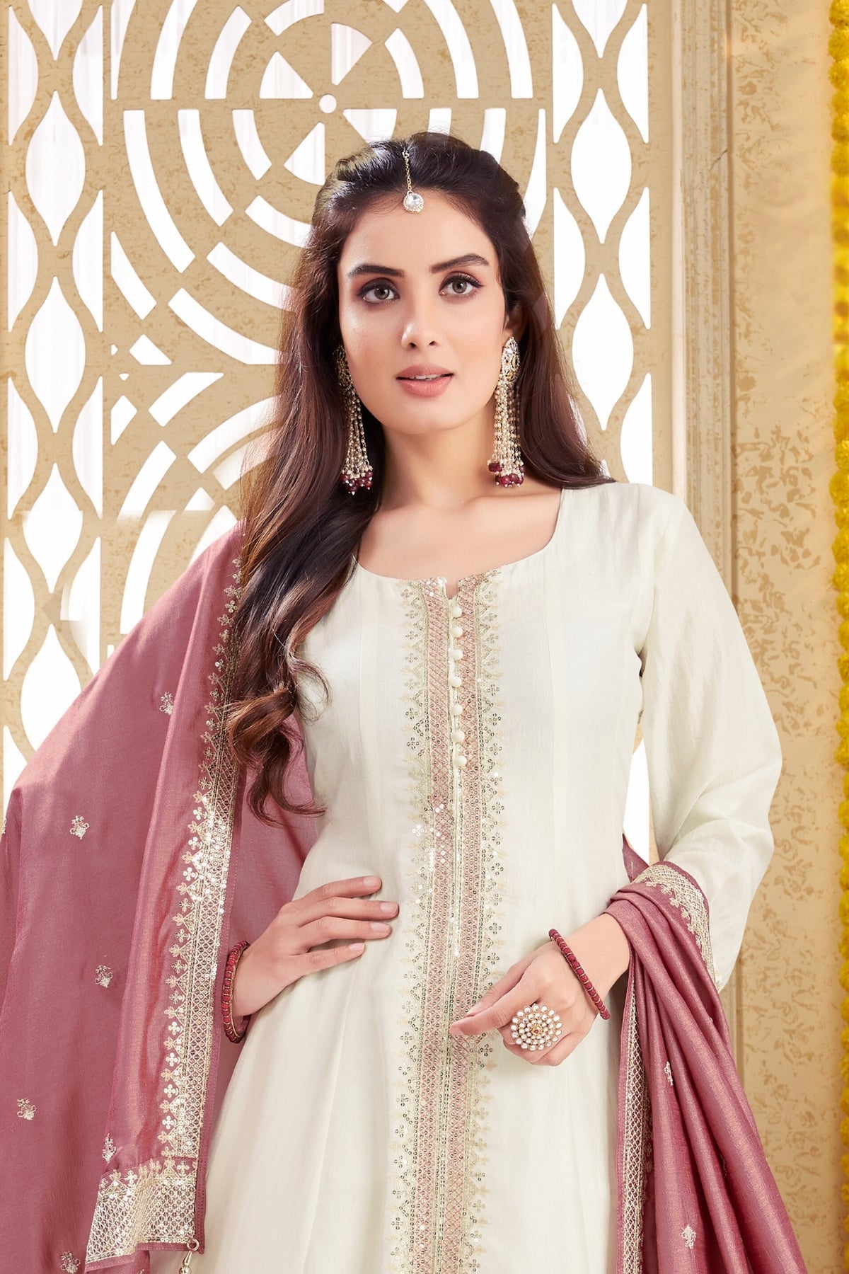 Introducing our elegant white and mauve Anarkali dress, complete with intricate embellishments for a stunning look. Made with high-quality materials, this dress exudes sophistication and style. The flowing silhouette and dhupatta add a touch of grace to any occasion. Elevate your wardrobe with this timeless piece.